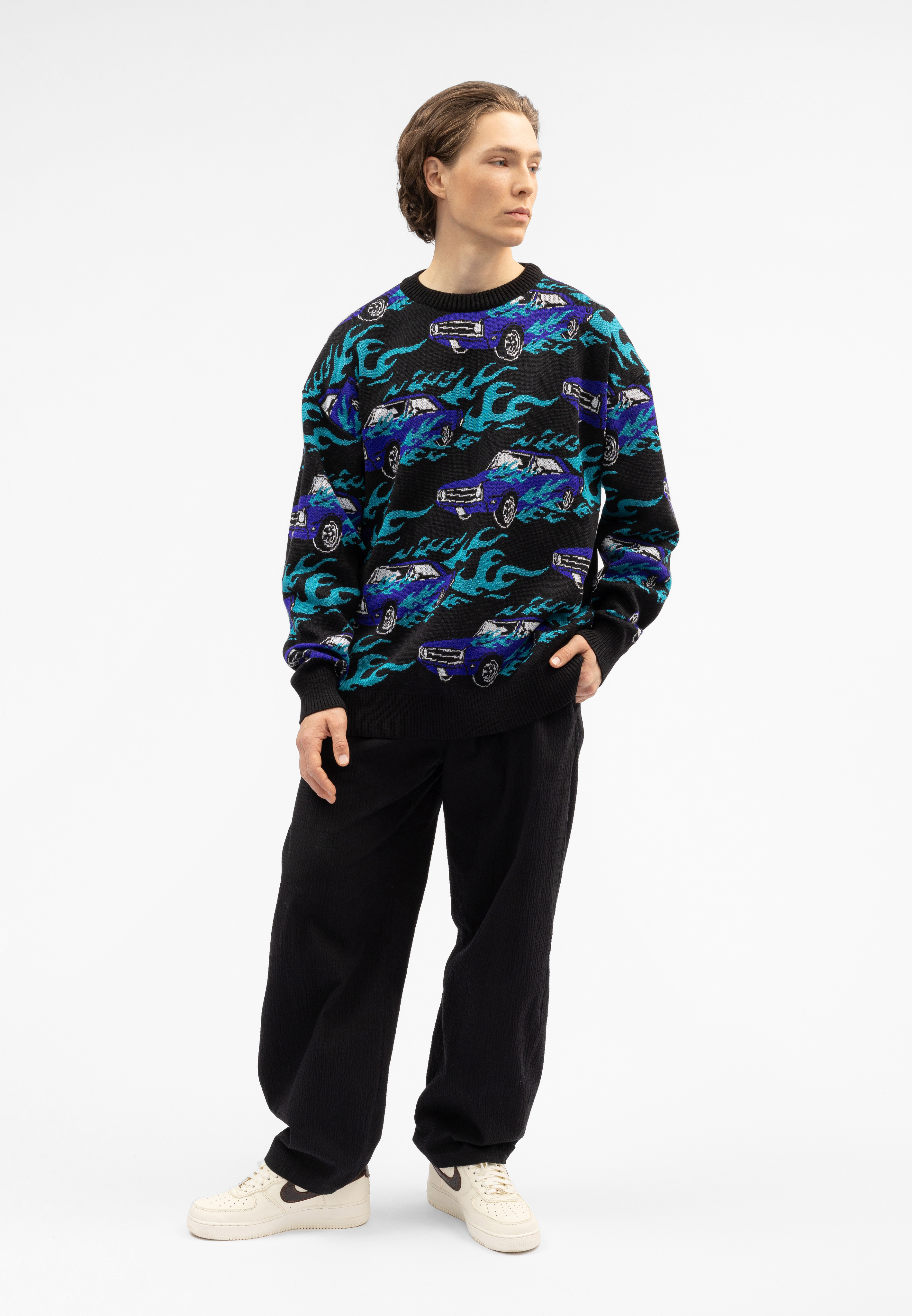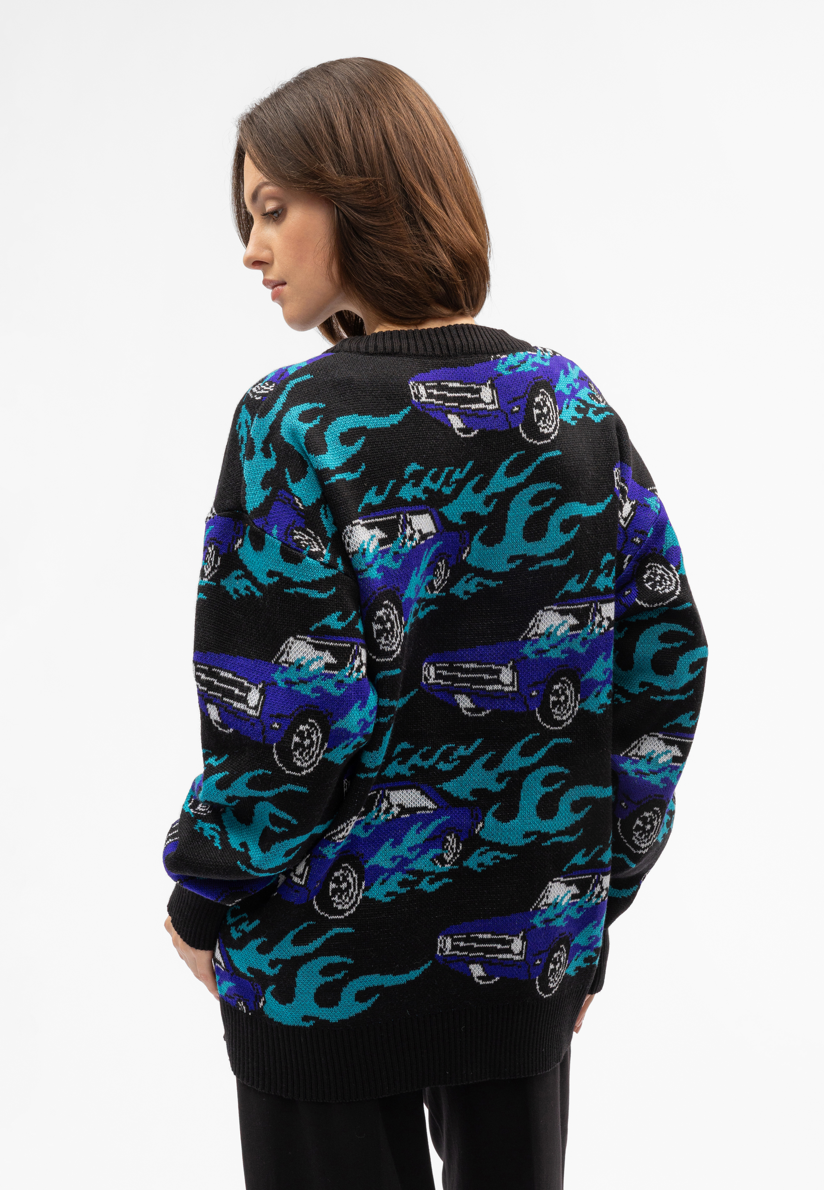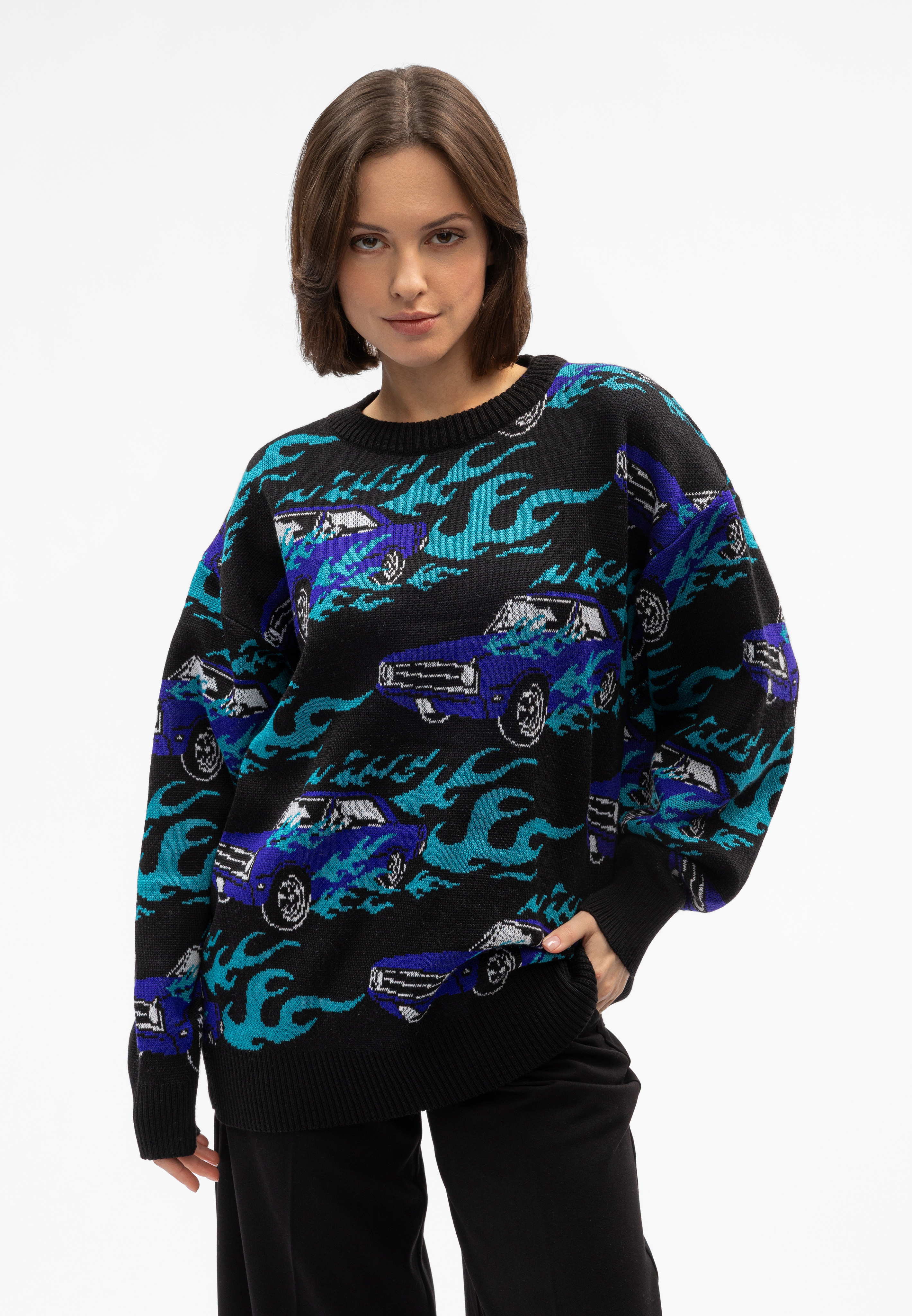 Вязаный жаккардовый свитер, со спущенной линией плеча. Оригинальный дизайн Behind The Scenes studio.